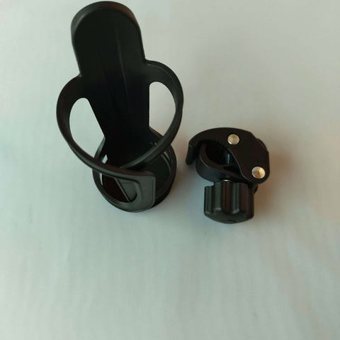 Denne mobil- og flaske- kopholder monteres rundt om stellet ved dit styr på et el løbehjul, en cykel, barnevogn eller andet, hvor den kan spændes fast. Den er lavet i hård plastik og giver sig alt efter hvor stor en flaske, du sætter ned i. Den passer til almindelige 0.5L – 1L. flasker, og hertil også kopper.