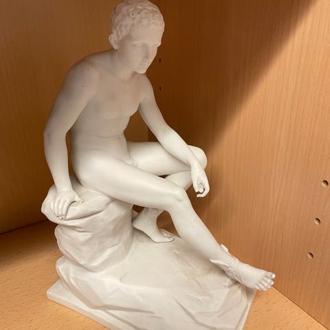 Beklageligvis er hans fiskestang knækket, men toppen medfølger. Hatten har 2 afslag. Ligeledes er hans ene hånd knækket af. Se fotos hvoraf det fremgår. For den fingerfærdige burde stang og hånd kunne repareres.