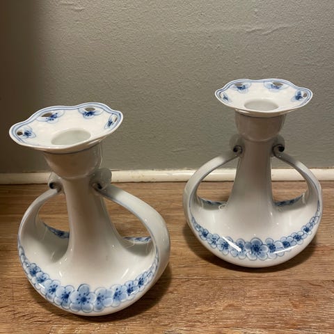 Empire, Blå Tone og Mågestel med og uden guldkant, flotte 2 armetlysernstager , så det hyggetid i stearinlysets skær🥰 det er også skønt med 2 lys på et bord ved spisetid💙