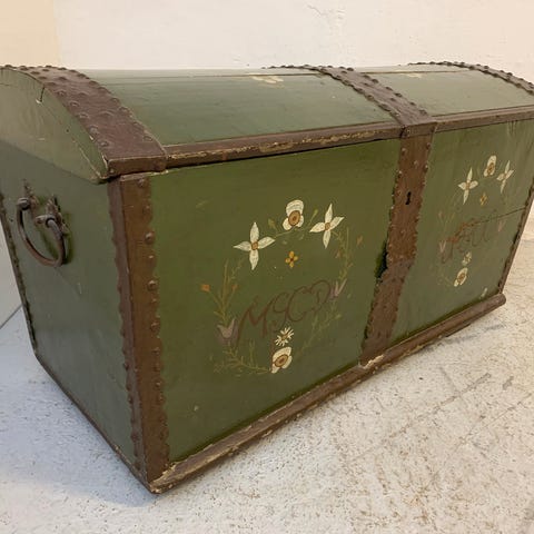 Gedigen gammel intakt kiste, udsmykket med jernbeslag og beslag som forstærker hjørnerne.