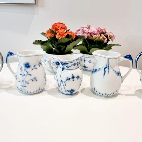 De smukke Danske Stel Blå Blomst, Blå Tone, sommerfugl og mågestel, har masser af historie og disse Salt og Pebersæt er uundværlige i din borddækning 🙂