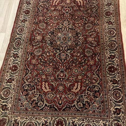 Stort, flot tæppe i smukke, overvejende røde toner, med beige og sand kontraster.