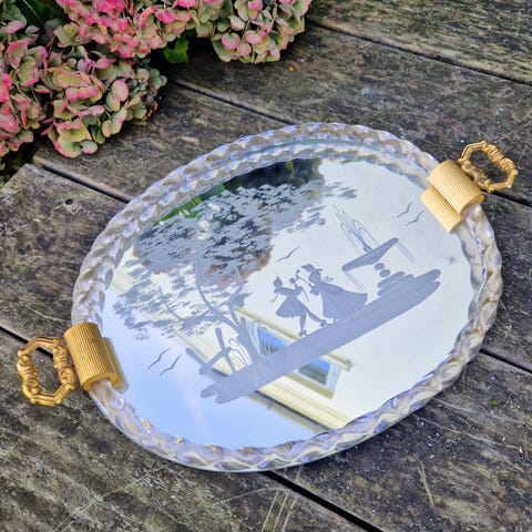 Rektangulær mondæn bakke med spejlbelægning, floralt mønster med galant scene, to forgyldte metalgreb i siden.