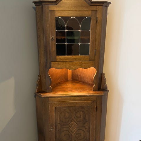 Gl. Hjørneskab, opdelt med glas vitrine og underskab, højde 191 cm.