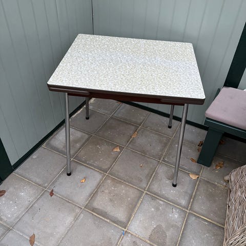 Tysk spise-køkkenbord. Pladen har nogen riser der er 2 sideplader der kan trækkes ud så det kan blive 107 cm. Bredt. Der er en rund ring med fjeder under bordet så man kan dreje bordet op og ned. Preben genbrugsshop-Nakskov.