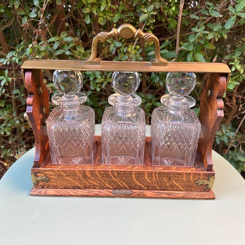 Tantalus, England ca. 1870. Træ med sølv plet, og krystal Karafler. Med nøgle, ved brug af nøglen vippes karaflerne ud af stativet. Flot stand.