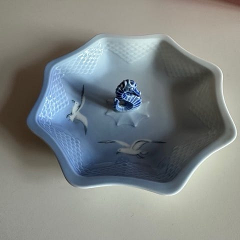 De er slet ikke til at stå for søhesten i midten, de flotte ottekantet fade med høj kant fra Bing & Grøndahl.🥰