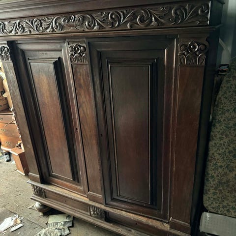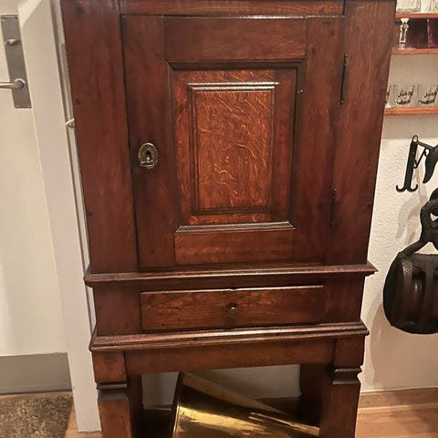 Gammel skab i egetræ med 3 hylder og en skuffe.. det er 90 cm. Bredt 49 cm.dybt og det er 157 cm. Højt. Prebensgenbrugsshop-Nakskov. Lolland Falster.
