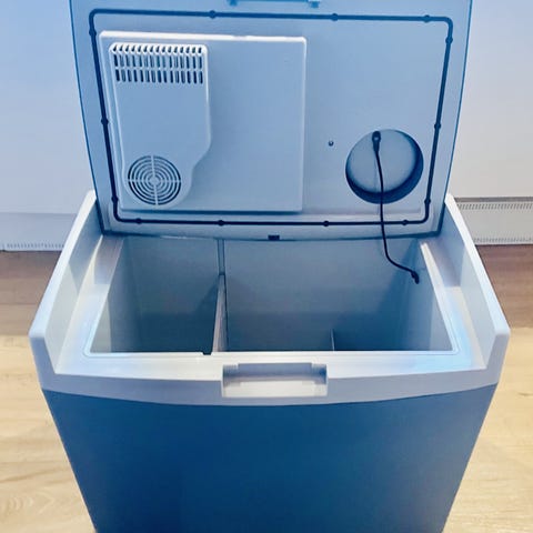 Til enten 12 v dc i bilen eller båden, eller almindelig 230 v ac i huset. Ved 12 v drift køler den 20 grader under den omgivende temperatur. Ved 230 v køler den ned til -15, men kan reguleres til den temperatur der ønskes. Ca. 40 liter. Den er så stor at du kan have 1,5 l sodavand stående. Støjsvag og bruger ikke ret meget strøm.
