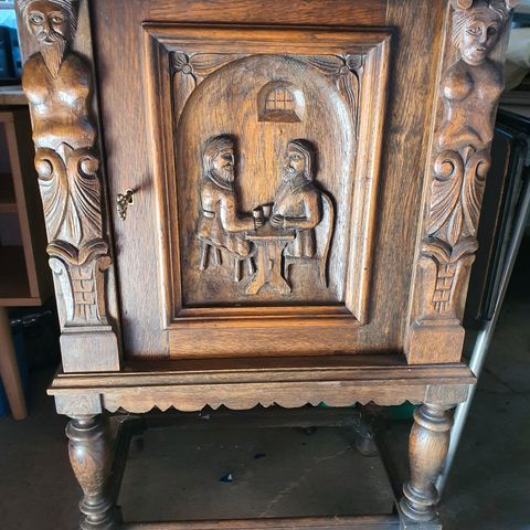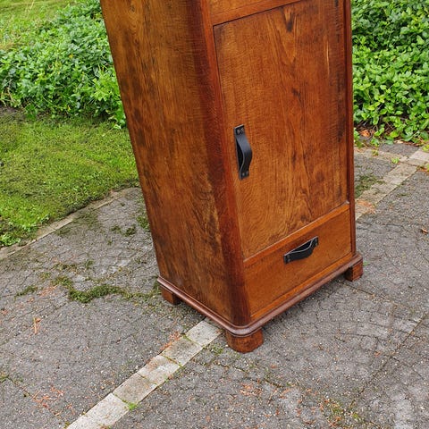 Lille fint dæktøjsskab i egetræ med 2 låger med blyindfattede ruder og 2 skuffer. Prebensgenbrugsshop-Nakskov.