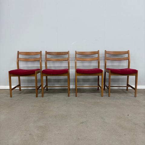 4 stk super fede retro spisebords stole i fyrretræ med brun stribet betræk, som faktisk er rigtig fint.