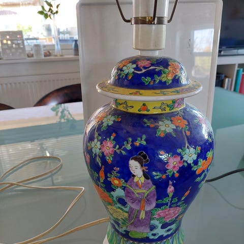 Flot og farverig lampe, bemalet med motiver af kinesiske mænd.
