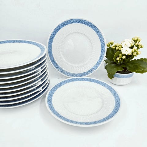 Her har vi morgenmads tallerkener, til sommerens jordbær, eller til en portion varme linser, til forretten eller desserter, små dybe er super anvendelige, Blå Vifte er et smukt stel, det fine mønster i relief 🥰
