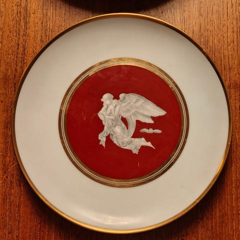 Her har vi et lille stykke kunst, det er Thorvaldsen I Relief, lavet af glaseret hvidt riflet porcelæn og Biscuit.