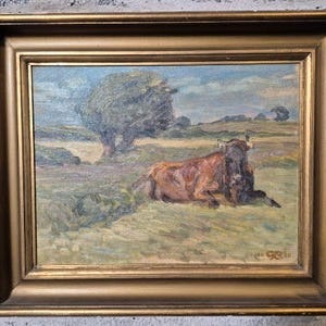 Maleri, sign. Monogram, liggende ko på mark, mål incl. ramme.