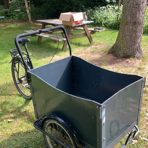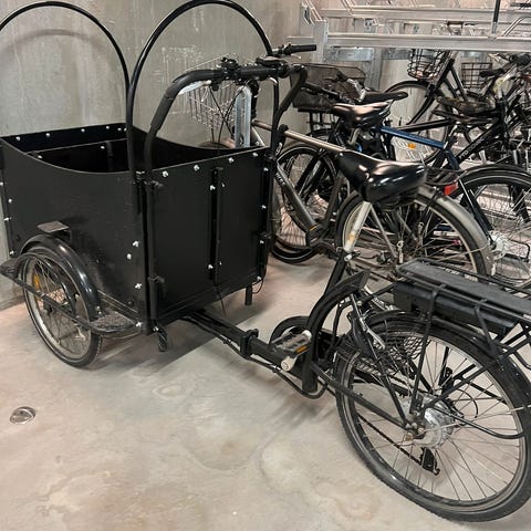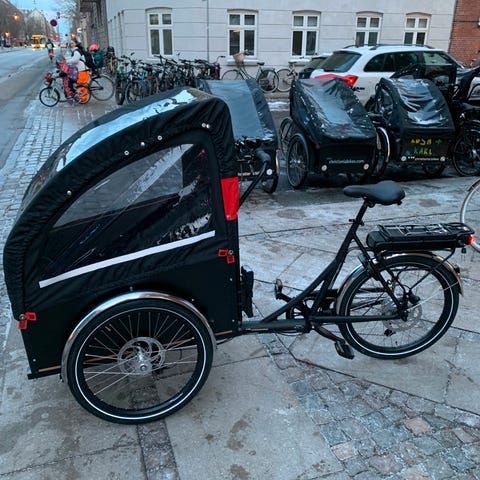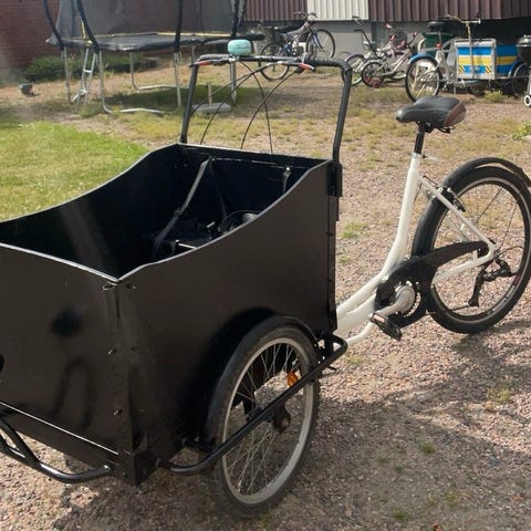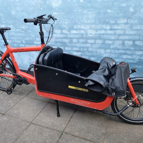A fun and agile "longjohn" cargo bike with powerful Brose motor. The basket has a foldable bench with seatbelts for two smaller kids (ages 2-6 recommended), or one bigger kid.
