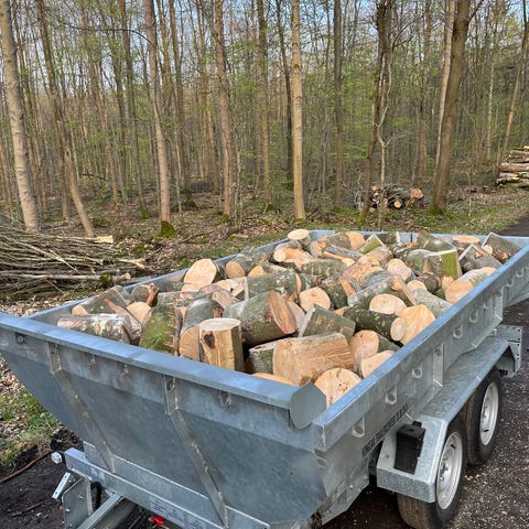 vi har bøgen i Brændebure der indeholder ca. 1,17 krm = 1 Skrm. så tømmer du bare buret i din trailer- eller vi kan vippe buret rundt.