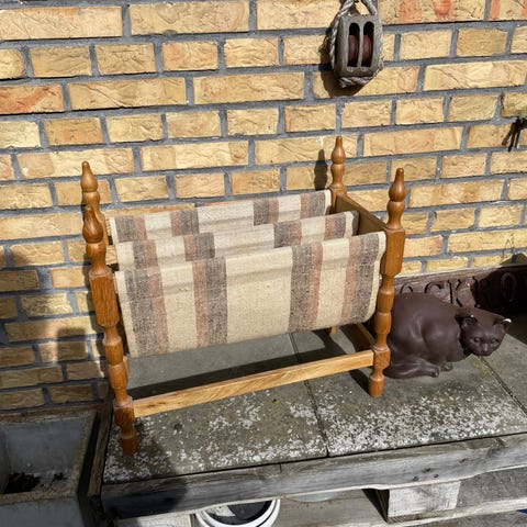 Super flot og sjælden magasinholder i massiv egetræ med brun stribet stof. Den er designet af Poul Hundevad og nok fra omkring 70'erne.