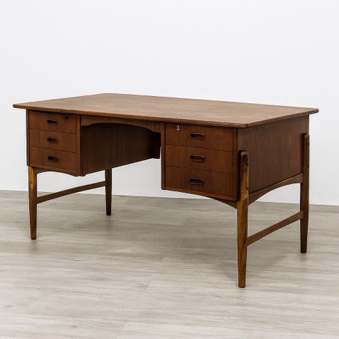 Skrivebord af teaktræ. Dansk, forside med skuffer. B: 164 cm, D. 82 cm, H. 75 cm