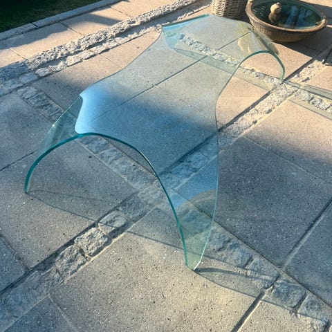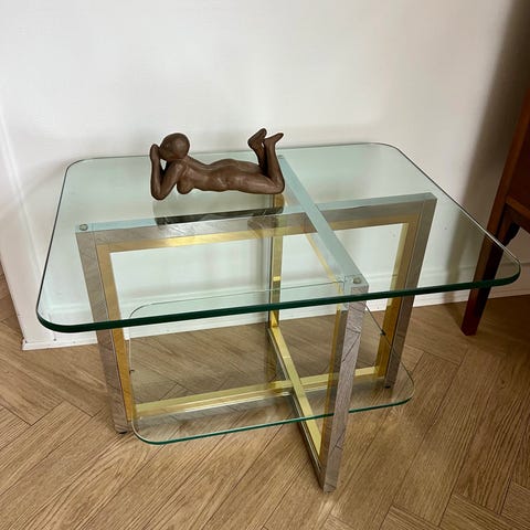 Flot kvadratisk udformet bord, fransk design, udført i træramme, med hærdet glasplade på toppen, samt under bordpladen.