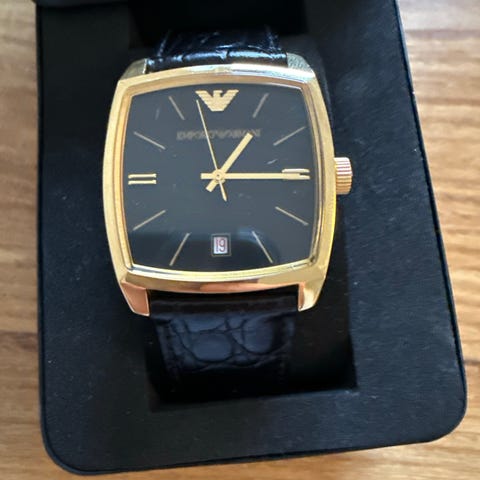 Armani herreur med original brun læderrem. Riflet optrækskrone med logo. Cremefarvet urskive med stregindex og romertal. Quartz urværk. Monteret med rem af original brunt læder og spænde af stål. Rem har flot patinering. Urkasse Ø. 42 mm.