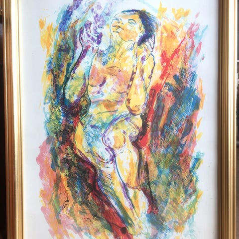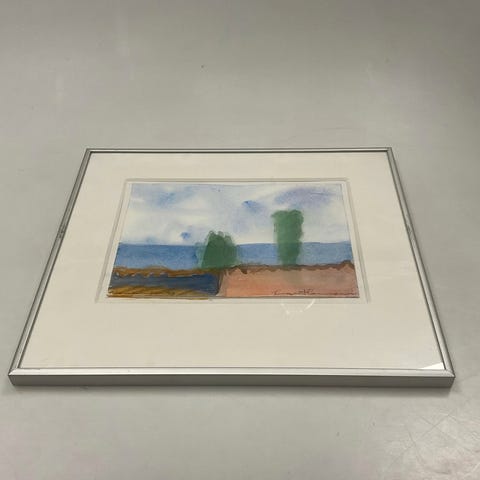 Stilfuldt værk i blå, sorte og gyldne nuancer.