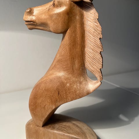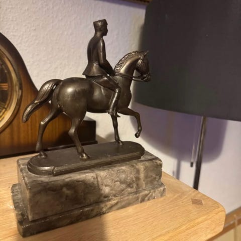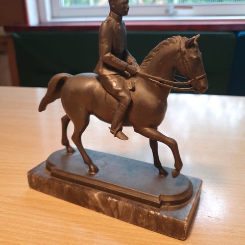 Kong Chr.X til hest, monteret på samtidig træfod, flot stand, fra år 1941, højde incl. Træfod: 21,5 cm., længde 18 cm.