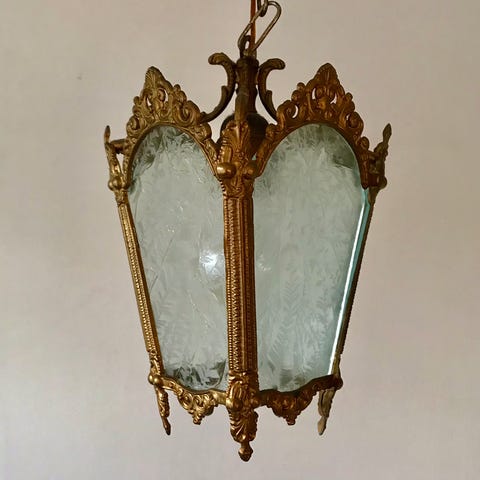 Smuk dekorativ messing loftlampe i rokokostil med de originale glas, støvede glas med sleben stjerne på hvert glas.