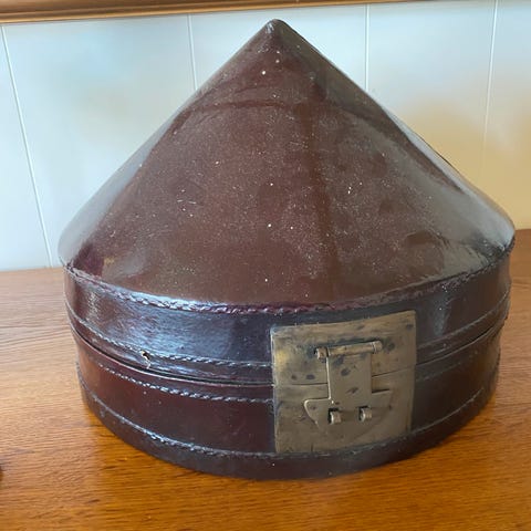 Spændende gammel hessian hatteæske med monogram E H P 1878 og påskrift
