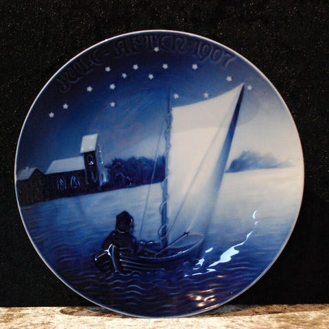 Platte, Bing & Grøndahl , 1924, Jule aften 1924. Fremstår flot og intakt. På bagsiden har den indridset streger. Stemplet B&G. Den måler 18 cm Ø.