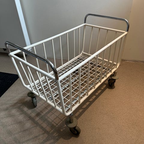Super fed papirkurv i bemalet stål med sjeneflet på håndtaget, fremstår med brugsspor og div mærke. Fletten er intakt. Fra 1960’erne.