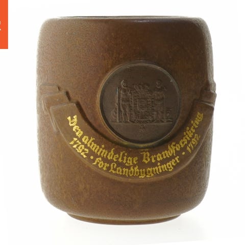 Smuk stor Arne Bang krukke med originalt låg. Jubilæums krukke for “Den almindelige brandforsikring”. Højde 19 cm