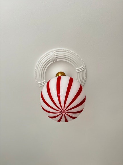 Smuk Murano candy/bolche loftslampe i hvid og rød med et smukt ophæng i enten messing eller stål.