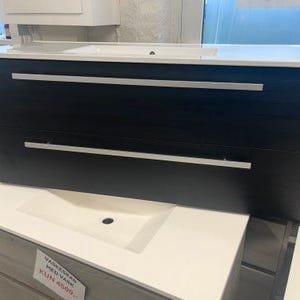 Badeværelses møbel. 80 cm. bred - 46,5 cm. dyb. Med hvid bordplade. Skuffer og låger med softclose. - pris ekskl. spejl-armatur og andet tilbehør - kan dog tilkøbes.Kig på mine andre annoncer… Hvis man køber FLERE sæt er jeg til at handle med. søgeord - badmøbel-badeværelse-bad-bad inventar-badvask-badeværelses vask-badmøbel