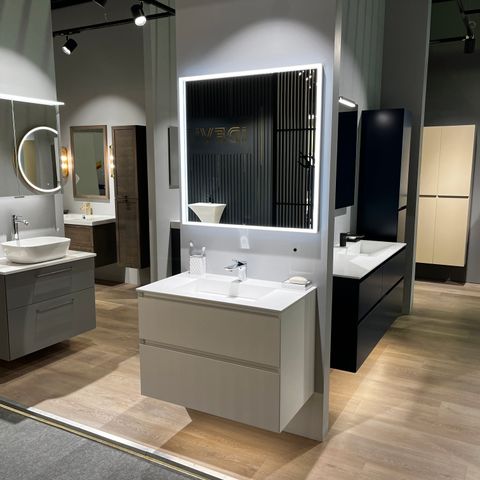 Hvidt badeværelses møbel med sort matlakeret indfræst gribeliste. 100 cm. bred - 46,5 cm. dyb. Højskab 35 cm. bred. Med Porcelænsvask.Alle skuffer med softclose. Fra udstilling - er taget ned og står klar til afhentning. (det på billedet er 60 cm. bredt) - pris ekskl. spejl-armatur og andet tilbehør - kan dog tilkøbes. Kig på mine andre annoncer… Hvis man køber FLERE sæt er jeg til at handle med. søgeord - badmøbel-badeværelse-bad-bad inventar-badvask-badeværelses vask-badmøbel