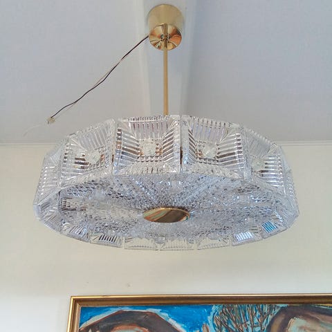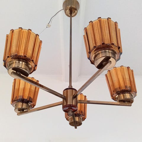Meget flot retro 5 armet lysekrone, Carl Fagerlund for Orrefors. Udført i messing med støbte glasskærmer. I meget flot stand, fra 50'erne. Mål: ca. 68xØ50 cm, skærme ca. 12,5xØ11,5 cm. Til salg 4.000 kr. Lamp-523.