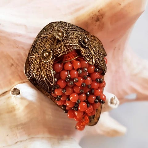 Antik Kinesisk filigran tørklæde clips i forgyldt sølv prydet med koral, perler og sort emalje. Mål: 3,5x3,5 cm, 9,1 gr. Til salg 1.400 kr.