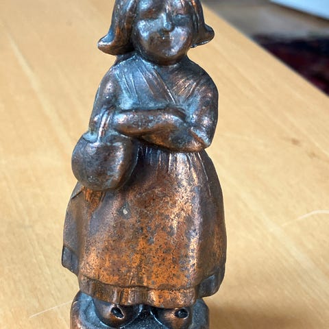 Super sød antik miniature figur i bemalet metal med flot patina. Usigneret, minder meget om Wienerbronze. Mål: 7x2,3 cm, 98 gr. Til salg 940 kr.