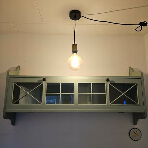 Vitrineskab til ophæng. Hylder i højre side, venstre side, hylde og ophæng til glas.