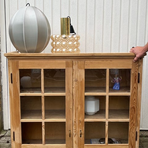 Gl væg vitrine, grå med rosa nuancer indeni.