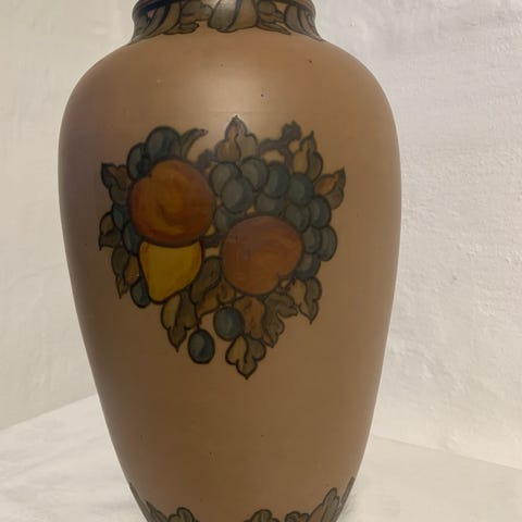 Flot sort terracotta vase med bukke fra 1880-1910. Udført hos L. Hjorth Bornholm. Fremstår i god stand med lille ubetydelig afslag på bunden. Mål: 24xØ 21 cm, 1,3 kg. Til salg 4.200 kr.