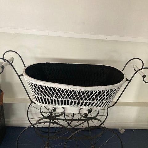 Antik barnevogn. Smuk. Malet på et tidspunkt. Der står Mie på den. Brug den til opbevaring af tæpper. Eller katteseng. Vattæppet følger med.
