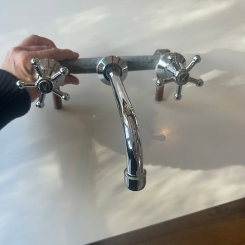 Toni Albue 2 huls i krom med svingtud. Armaturet er nyrenoveret, kalk renset og har fået nye tætninger og O-ringe som sikrer lang levetid og fejlfri funktionalitet.