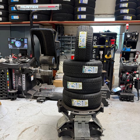 4 stks dæk med montering. Afbalanceres med vejtryk. Bil på lift.