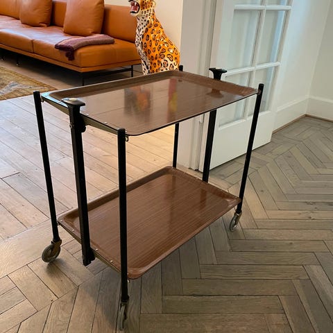 Smuk retro barvogn med røgfarvede glasplader, flaskeholdere og mange smukke detaljer.