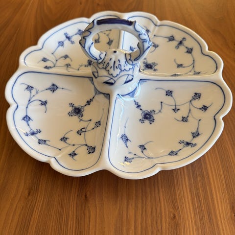 Antikt Royal Copenhagen Musselmalet Riflet todelt cabaretfad fra år 1850-70.