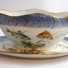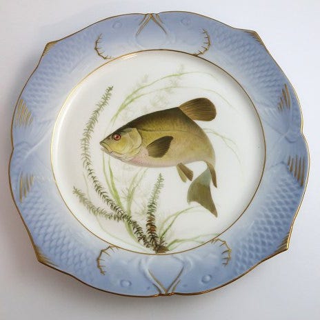(12 forskellige) , blåmalet fiske bort og guld kanter.