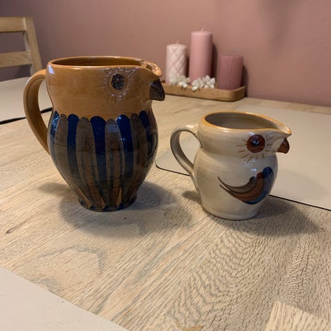 Højde: 13cm. Kanden er i hel og i fin stand med et par enkelte små glasur afslag på kanten.