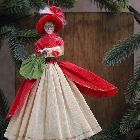Gammelt juletræspynt , fin dame med paraply lavet i farvet krep papir.