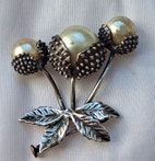 Flot broche i sølv formet som blomster med store perler som pynt.
